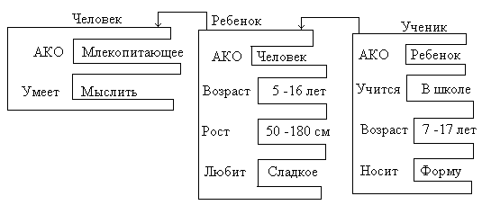 Понятие «ученик» наследует свойства фреймов «ребенок» и «человек», которые находятся на более высоком уровне иерархии, На вопрос: «любят ли ученики сладкое?» следует ответ - «да», т.к. этим свойством обладают все дети, указанные во фрейме «ребенок».