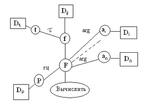 Дуги имеют метки падежных отношений: S – субъект, О – объект, К – отношение «посредством чего», Dj – области допустимых значений действующего аргумента.