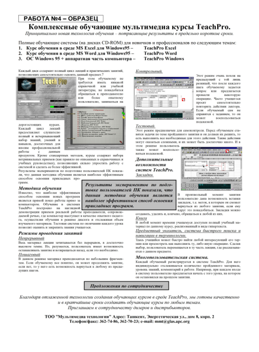 Почти весь текст рекламного листа уже набран и сохранен в файле-заготовке. Поэтому вы можете скопировать этот текст в свой документ и основное внимание уделить оформлению документа, а не печатанию. В работе описано, какие команды форматирования и в каком порядке удобнее применять для оформления рекламного листа.
