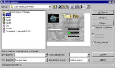 В диалоговом окне вставки рисунка (рис. 1) перейдите в папку Общие документы\Практикум по ИТ\Практические работы по Word\Работа 4 и выберите файл REKL1.GIF. Перед тем, как нажать кнопку Добавить, убедитесь, что в окне включен флажок Поверх текста (рис. 4.1). В режиме «Внутри текста» рисунку нельзя будет назначить обтекание текстом.