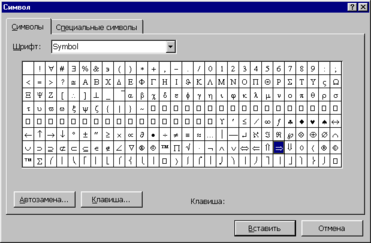 В диалоговом окне с таблицей символов (рис. 1.11) есть список шрифтов, установленных в Windows. Для вставки греческих букв и математических символов в этом списке должен быть выбран шрифт Symbol (как на рис. 1.11). Для вставки символа в позицию курсора надо выбрать его в таблице символов и нажать кнопку Вставить в нижней части окна.