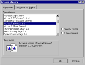 Для создания новой формулы сделайте новый абзац и выберите команду ВставкаОбъект. В диалоговом окне (рис. 3.1) в списке объектов с помощью вертикальной полосы прокрутки выберите Microsoft Equation 3.0, убедитесь, что флажок Поверх текста выключен и нажмите кнопку OK. При выключенном флажке Поверх текста формула будет помещена внутрь текста, и будет вести себя при форматировании как один большой символ.