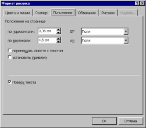 Отключите у рисунка флажок перемещения вместе с текстом и на закладке Положение установите привязку «Положение по вертикали/по горизонтали» типа «От поля» (рис. 1.14).
