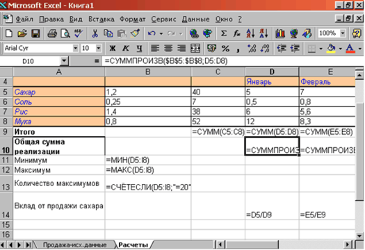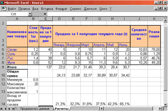 На рис. 2.11. показано как выполняется определение минимального (В11) и максимального (В12) количества товаров за полугодие, количество максимальных продаж (В13) и вклад от продажи сахара в общее количество проданного товара (D14:I14). Результаты вычислений приведены на рис. 2.12.
