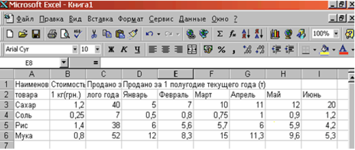 | Наименование товара | Стоимость 1 кг (грн.) | Продано за 1 полугодие прошлого года (т) | Продано за 1 полугодие текущего года (т) | |||||