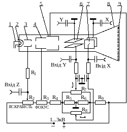 Блок ЕПТ складається з ЕПТ та схеми керування електронним променем (Рис.6.48). ЕПТ являє собою скляну колбу, в якій розміщена так звана електронна гармата, створена групою електродів: катодом 2 з ниткою розжарювання 1, анодами 4 і 5, модулятором 3 (керуючим електродом). Живлення електронної гармати здійснюється від джерела високої напруги 1...3 кВ. Емісія електронів відбувається з торцевої поверхні катода, в центральній частині якого нанесений оксидний шар.