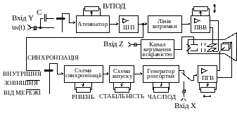 Досліджуваний сигнал ux(t) через Вхід Y подається на атенюатор або безпосередньо (відкритий вхід), або через розділювальний конденсатор С (закритий вхід). Якщо вхід відкритий, то в канал вертикального відхилення проходять як змінна, так і постійна складові сигналу. В противному разі через конденсатор С проходить тільки змінна складова сигналу. Вихідний сигнал атенюатора підсилюється широкосмуговим підсилювачем ШП і подається, по-перше, через лінію затримки і підсилювач вертикального відхилення ПВВ на вертикально відхильні пластини ЕПТ, і по-друге, - в канал горизонтального відхилення променя для синхронізації генератора розгортки.