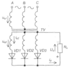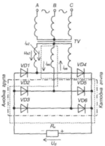 Тут шість випрямних діодів увімкнені у трифазну мостову схему і утворюють дві групи: анодну - VD1.VD2, VD3 та катодну - VD44 VD5, VD6.