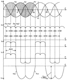 . Струм навантаження в даній схемі викликаний лінійною напругою. Основні розрахункові співвідношення можна отримати із часової діаграми випрямленої напруги, наведеної на рис. 9.14.