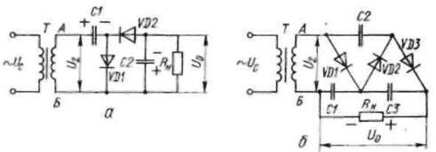 Проста схема випрямляча з помноженням напруги приведена на мал. 19.6, а. Діє така схема таким чином. Протягом позитивного напівперіоду, коли потенціал точки А вторинної обмотки силового трансформатора позитивний щодо точки Б, конденсатор С1 заряджається через діод VD1 до напруги, рівної амплітуді напруги на вторинній обмотці трансформатора U2m. У другий напівперіод, коли потенціал точки А стає негативним, а точки Б - позитивним, вторинна обмотка трансформатора виявляється сполученою з конденсатором С1 таким чином, що напруга на їх виводах складається. Під впливом цієї сумарної напруги конденсатор С2 через діод VD2 заряджається майже до подвоєного значення амплітудної напруги на виводах вторинної обмотки трансформатора 2U2m. В процесі заряду конденсатора С2 відбувається розряд конденсатора С1. Потім процес повторюється. При цьому напруга на опорі навантаження, підключеному паралельно конденсатору С2, пульсує з частотою напруги мережі.
