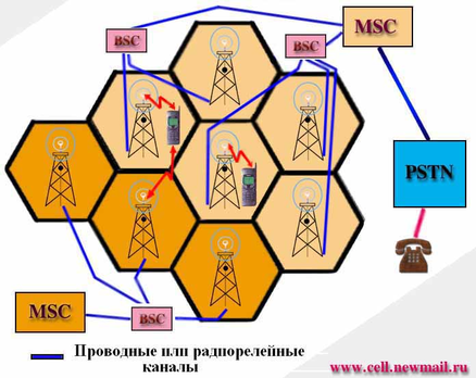 Базові станції мережі через контроллери (BSC) сполучені дротяними телефонними (або радіорелейними) лініями зв'язку з центральною станцією даного регіону ( міста, області) - MSC (Центр комутації рухомого зв'язку), яка забезпечує з'єднання мобільних абонентів з абонентами телефонної мережі загального користування (ТФОП, або PSTN) за допомогою комутаційних пристроїв. Таким чином кожен MSC обслуговує групу сотів, здійснюючи при цьому перемикання каналів в соті, естафетну передачу абонентів між сотами, формує дані, необхідні для виписки рахунків за надані мережею послуги зв'язку, накопичує дані по розмовах, що відбулися, і передає їх в центр розрахунків (биллинг-центр). MSC складає також статистичні дані, необхідні для контролю роботи і оптимізації мережі. На рис.1 групи сотів і відповідні їм MSC представлені різним кольором. MSC не тільки бере участь в управлінні викликами, але також управляє процедурами реєстрації місцеположення і передачі управління. Реєстрація місцеположення рухомих станцій необхідна для забезпечення доставки виклику рухомим абонентам, що переміщаються, від абонентів телефонної мережі загального користування або інших рухомих абонентів. Процедура передачі виклику дозволяє зберігати з'єднання і забезпечувати ведення розмови, коли рухома станція переміщається з однієї зони обслуговування в іншу. Передача викликів в сотах, керованих одним контроллером базових станцій (BSC), здійснюється цим BSC. Коли передача викликів здійснюється між двома мережами, керованими різними BSC, то первинне управління здійснюється в MSC. Таким чином, ієрархію управління в межах одного MSC можна представити як взаємодія підсистеми базових станцій (BSS), що включає BSC з декількома BTS, і MSC .
