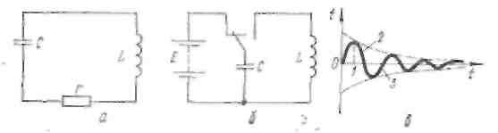а — коливальний контур; б — розряджання конденсатора; в — графік затухаючих коливань.