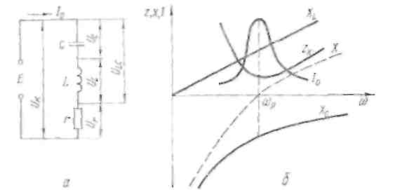 Рис. 1-29. Послідовний коливальний контур (а) і графік залежності реактивних опорів від частоти (б).