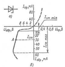 1. Напруга стабілізації UCT - падіння напруги на стабілітроні при протіканні заданого струму стабілізації - визначається значенням номінального струму стабілізації. Оскільки робочу ділянку вольт-амперної характеристики має деякий нахил, напруга стабілізації відрізняється від напруги, при якій відбувається пробій p-n-переходу. Тому напруга стабілізації визначається значенням номінального струму стабілізації Iст (точка А на мал. 2.13,6).