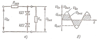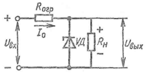 Наприклад, якщо вхідна напруга зросте, то збільшується і струм стабілітрона, а звідси зросте струм I0 і падіння напруги на обмежувальному опорі Rorp. Прирости напруги ΔUВХ і ΔIORorp взаємно компенсуються, а UBX зберігається на заданому рівні.