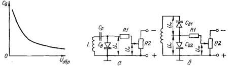 Основне застосування варикапа - електронна настройка коливальних контурів. На рис, 9.16, а приведена схема включення варикапа в коливальний контур. Контур утворений індуктивністю і місткістю варикапа Св. Розділовий конденсатор Ср служить для того, щоб індуктивність не шунтувала варикап по постійному струму. Ємність конденсатора Ср повинна бути в декілька десятків разів більше ємності варикапа.