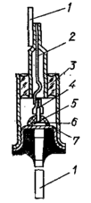 Варикапами називають напівпровідникові діоди, у яких використовується бар'єрна ємність замкнутого р-п-прехода, що залежить від величини прикладеної до діода зворотної напруги. Конструкція варикапа показана на рис, 9.12. У кристал кремнію 5 з однієї його сторони вплавляють у вакуумі алюмінієвий стовпчик 4 для отримання р - п -перехода, а з іншого боку - сплав золото - сурма для отримання омічного контакту 6. Ця структура вплавляється у вакуумі в коваровий позолочений кристалотримач 7. До алюмінієвого стовпчика прикріплений внутрішній вивод 5. З'єднання кристалотримача з балоном 3 і виводом 1 здійснюється сплавом у водні.