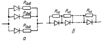 Для вирівнювання струмів, що протікають через діоди, послідовно з діодами включаються омічні додаткові резистори близько декілька Ом. Це дозволяє штучно зрівняти прямі опори діодів, які для різних зразків приладів можуть бути істотно різними.