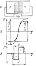 а - подвійний шар зарядів в р - п-переході; б - зміна потенціалу φ уздовж переходу; в - зміна щільності об'ємного заряду р.