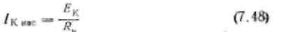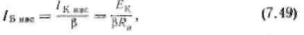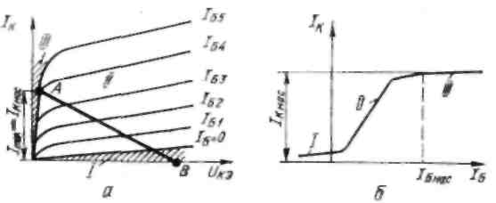 На мал. 7.20, а приведені вихідні статичні характеристики транзистора із загальним емітером. У сімействі цих характеристик проведена пряма навантаження АВ, що виражає залежність струму колектора від напруги на колекторі. Величина струму колектора визначається головним чином величиною струму бази: чим більше струм бази (вхідний струм), тим більше струм колектора. При деякому значенні струму бази колекторний струм досягає максимальної величини Ікмах. Така величина колекторного струму відповідає робочій точці А на мал. 7.20, а. При подальшому збільшенні струму бази струм колектора практично залишається незмінним. Тому струм отримав назву струму насичення і позначається Ікнас. Величина струму насичення відкритого транзистора може бути знайдена по формулі