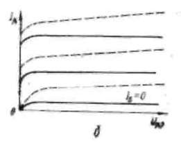 Діапазон робочих температур транзисторів, що визначається властивостями р-п переходів, такий же, як і у напівпровідникових діодів. Особливо сильно на роботу транзисторів впливає нагрів і менш істотно - охолоджування (до - 60°С). Дослідження показують, що при нагріві від 20 до 60° З параметри площинних транзисторів змінюються таким чином: rк падає приблизно удвічі, rб - на 15-20%, а rе зростає на 15-20%. Уявлення про вплив нагріву на h- параметри дають графіки мал. 7.17, а, побудовані для малопотужного площинного транзистора, включеного по схемі із загальною базою. Окрім зміни значення основних параметрів транзистора, нагрів викликає зсув вихідних характеристик і зміна їх нахилу (мал. 7.17, б), що також порушує нормальну роботу приладу.