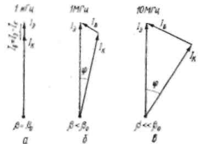 Це явище ілюструється векторними діаграмами, приведеними на мал. 7.18. Перша з них відповідає низькій частоті, на якій всі струми практично співпадають по фазі, а коефіцієнт ρ має найбільшу величину.