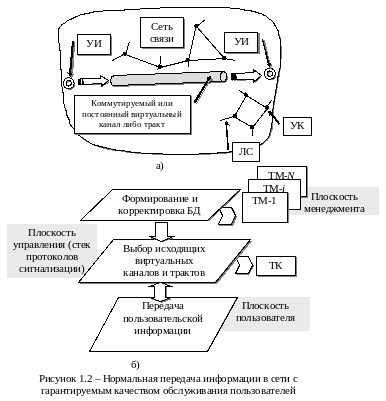 При этом передача всех видов информации в сети (служебной – для формирования БД и ТК; пользовательской) осуществляется по своим отдельно выделенным виртуальным соединениям (каналам и трактам).