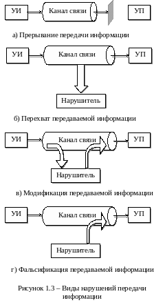 Под нарушением передачи информации будем понимать одну из ситуаций, которые могут быть организованы нарушителем (рисунок 1.3).