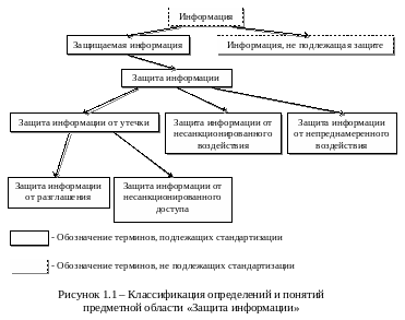 На рисунке 1.1 приведена классификация основных определений и понятий предметной области «Защита информации» [1, 2].