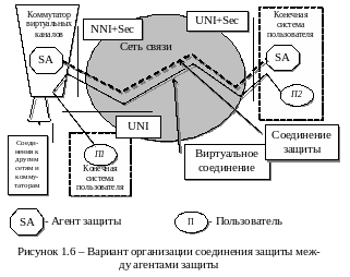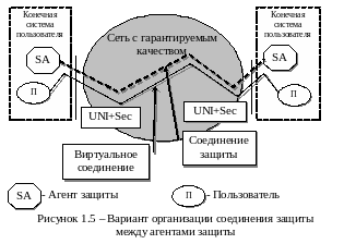 Рисунок 1.5 демонстрирует самый простой вариант организации соединения защиты - агенты защиты размещены в пределах конечных систем пользователей. В данном случае конечные системы и агенты защиты взаимодействуют с сетью через интерфейс «пользователь – сеть + защита» (UNI+Sec).