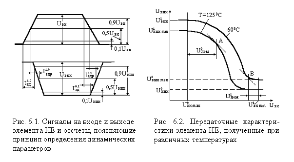 В статическом режиме помехоустойчивость определяется по низкому U0пом и высокому U1пом уровням. Значения U0пом и U1пом определяют с помощью передаточных характеристик (рис. 6.2.). Как следует из рис. 6.2, напряжение помехи по высокому уровню определяется как разность минимального напряжения высокого уровня U1вхmin и напряжения в точке перегиба верхней кривой (точка В). Параметр U0пом определяется как разность напряжения низкого уровня U0вхmax.
