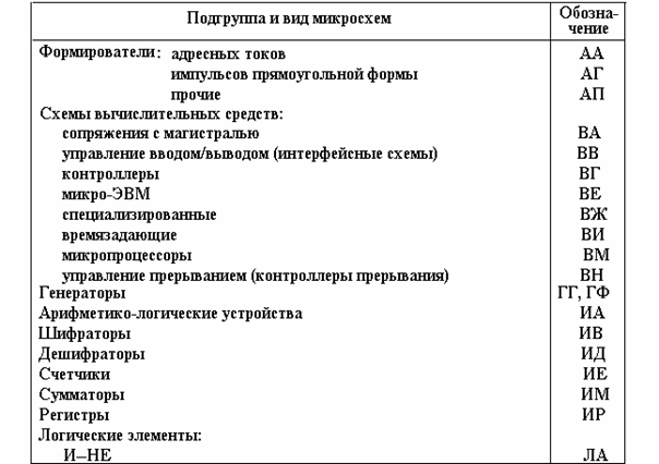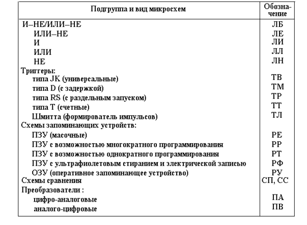 По принятой системе, обозначение микросхемы должно состоять из четырех элементов. Первый элемент - цифра, соответствующая конструктивно-технологической группе. Второй элемент - две-три цифры, присвоенные данной серии как порядковый номер разработки. Таким образом, первые два элемента составляют три-четыре цифры, определяющие полный номер серии микросхемы. Третий элемент - две буквы, соответствующие подгруппе и виду (табл. 6.1). Четвертый элемент - порядковый номер разработки микросхемы в данной серии, в которой может быть несколько одинаковых по функциональному признаку микросхем. Он может состоять как из одной цифры, так и из нескольких.