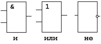 Существуют три базовых логических элемента, выполняющих логические операции сложения, умножения и отрицания: элемент И, элемент ИЛИ и элемент НЕ (инвертор), которые обозначаются на принципиальных электрических схемах как показано на рис.1