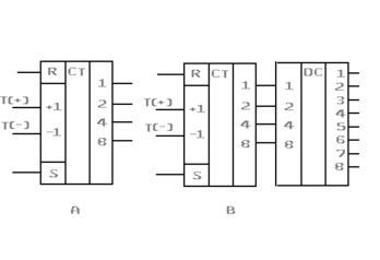 Замкнув в кольцо регистр сдвига можно получить кольцевой счетчик, например как на рис.5. Начальная установка осуществляется при V="1" подачей импульса на С1. В счетном режиме, когда V="0" и тактовые импульсы поступают на С2, наблюдается сдвиг логической единицы по кольцу на выходах Q1-Q4: 1000, 0100, 0010, 0001 и т.д. с коэффициентом пересчета равным 4. Возникновение случайной помехи ("0") на D1 приведет к стиранию "бегающей" единички. Соединив выходы Q1-Q4 через элемент ИЛИ-НЕ с входов I получим кольцевой счетчик с коэффициентом 5 без влияния помех.Простейшим счетчиком с модулем счета 2 может служить триггер. Соединив последовательно N триггеров получим двоичный счетчик с модулем счета 2N. Различают суммирующие и вычитающие, а также реверсивные счетчики (рис.6А). Здесь Т(+) и Т(-) - счетные входы, R и S - установочные входы, Q1-Q4 - выходы.