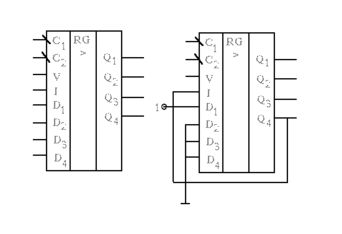 Здесь входы D1-D4 - для приема параллельного кода, а вход I - для приема последовательного, Q1-Q4 - выход информации в параллельном коде. Запись параллельного кода с D1-D4 происходит при V="1" и поступлении на тактовый вход C1 импульса. Запись последовательного кода осуществляется с входа I при V="0". После поступления 4 тактовых импульсов на вход С2 на выходах Q1-Q4 будет параллельный код.