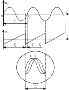 Для получения устойчивого изображения необходимо выполнить соотношение ТР = nТС, где n – целое число. Если n = 1, то на экране наблюдается один период исследуемого сигнала; при n = 2, 3,... на экране наблюдается два, три, и т.д. периодов сигнала.
