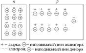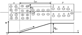 При соединении слоев происходит диффузия электронов из n-слоя в p-слой. Принимается условие, что концентрация электронов в n-слое больше концентрации дырок в p-слое. После диффузии электронов у границы n-слоя остается неподвижный положительный заряд ионов примеси (донора). В p-слое электроны рекомбинируют с дырками, в результате чего у границы p-слоя возникает неподвижный отрицательный заряд ионов примеси (акцептора). Область неподвижных зарядов ионов примеси в основном составляет p-n-переход (рис.2).