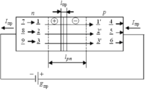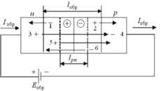 Во время диффузии электронов 1, 2, 3 n-слой также теряет электрическую нейтральность, приобретая избыточный положительный заряд. Между n-слоем и его выводом возникает электрическое поле, которое втягивает из внешней цепи электроны 7, 8, 9. В результате у левого и правого контакта, а также через структуру протекает прямой ток. Величина прямого тока определяется площадью p-n-перехода и зависит от приложенного прямого напряжения и ограничивающего сопротивления.