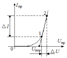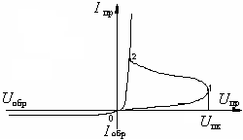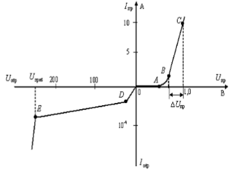 , а ток утечки пропорционален обратному напряжению. В точке Е происходит пробой p-n-перехода. Если материал полупроводника – кремний, то в точке Е происходит резкий переход на участок пробоя.