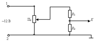Делитель напряжения (рис.4.) представляет собой цепь из двух последовательно включенных резисторов. Цепь подключается к источнику напряжения. С одного из плеч снимается выходное напряжение, которое получается меньше входного, т.е. ослабляется.