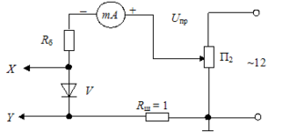 Схема позволяет снять прямую ветвь характеристики. Перед началом опыта движок потенциометра поставить в положение, показанное на рис.15. Внимание! Постепенно увеличивать напряжение от нуля.