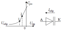Рис.11. Зависимость барьерной емкости от напряжения и условное обозначение варикапа