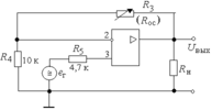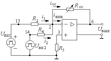 Для суммирующего усилителя используется инвертирующее включение операционного усилителя. В этой схеме действует параллельная отрицательная обратная связь по напряжению (рис.1). Сопротивление обратной связи Rос соединяет точки 6 и 2.