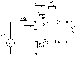 Пусть операционный усилитель является идеальным усилителем напряжения, тогда ток инвертирующего входа отсутствует, то есть Iвхи = 0. В этом случае точка 2 является виртуальным нулем, поэтому I = Iос (1). Значение токов определяются из соотношений: