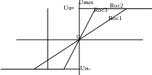 Коэффициент усиления по напряжению кос не зависит от коэффициента усиления операционного усилителя коу, так как петлевое усиление β*коу подчиняется соотношению β*коу >>1, где β – коэффициент передачи цепи обратной связи по напряжению. Амплитудная характеристика усилителя приведена на рис.2. Выходное напряжение изменяется до значения насыщения Uн±. Линейный участок амплитудной характеристики лежит в пределах изменения входного напряжения ΔUлин. По амплитудной характеристике определяется коэффициент усиления по напряжению: