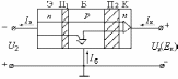 Под действием прямого напряжения Uэ происходит диффузия электронов из эмиттера в базу. Потенциальный барьер перехода П1 не препятствует диффузии, т.к. его ослабляет внешнее напряжение. В базе происходит диффузионное перемещение электронов от перехода П1 к переходу П2, если рассматривается транзистор диффузионного типа. В процессе диффузионного перемещения происходит рекомбинация электронов и дырок. Если заполненные электронные связи получаются устойчивыми, то к переходу П2 подходят не все электроны, которые были инжектированы в базу из эмиттера.