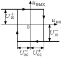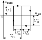 Для отрицательного выходного напряжения изменяется знак напряжения обратной связи на отрицательный. Чтобы переключить компаратор, необходимо на вход подать отрицательное напряжение, которое должно сравняться с напряжением обратной связи и превысить его на малую величину. В результате переключения усилителя под действием входного сигнала разной полярности получается релейная характеристика в виде петли гистерезиса (рис.9). Пока значение входного сигнала лежит в пределах петли, триггер сохраняет значение выходного сигнала. Это означает, что схема триггера обладает памятью. Значения напряжения Uос называются пороговыми Uпор.