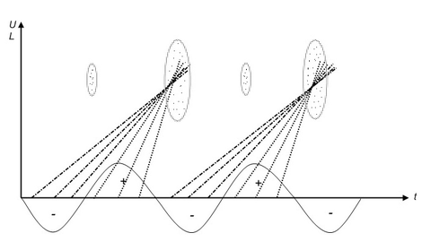 В результате такой модуляции возникают сгустки и разряжения электронов (Рис.5). Скорость электронов, после прохождения сеток входного резонатора, не меняется.