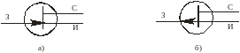 Рисунок 5.2 – Условное обозначение полевого транзистора с р-n-переходом и каналом n- типа (а), каналом р- типа (б)
