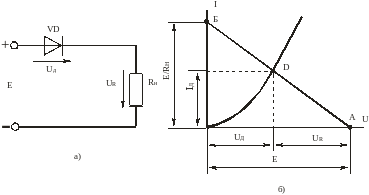 Режим диода с нагрузкой называют рабочим режимом. Если бы диод обладал линейным сопротивлением, то расчет тока в подобной схеме не представлял бы затруднений, так как общее сопротивление цепи равно сумме сопротивления диода постоянному току Rо и сопротивления нагрузочного резистора Rн. Но диод обладает нелинейным сопротивлением, и значение Rо у него изменяется при изменении тока. Поэтому расчет тока делают графически. Задача состоит в следующем: известны значения Е, Rн и характеристика диода, требуется определить ток в цепи I и напряжение на диоде Uд.